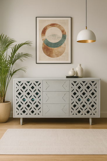 Introducing the Mango Sandblasted White CNC Design Sideboard, a stunning fusion of contemporary elegance and practical functionality. Crafted from solid mango wood, this sideboard features a sophisticated sandblasted white finish that beautifully accentuates the intricate CNC-cut detailing on its doors, infusing your space with modern charm and texture. With two spacious shutters and three drawers, it offers generous storage for everything from linens to living room essentials. The soft, muted white hue enhances the natural beauty of the wood grain, making it a versatile addition to both modern and coastal-inspired interiors. Elevate your home with this perfect blend of style and utility.